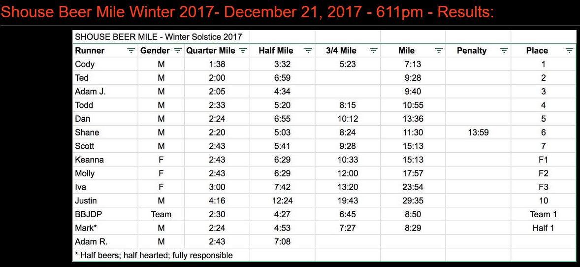 | December 21st, 7:34am - 4:59pm | Shoustice | Park at Shelter 14, Run at Shouse | Results: (Quick Link)(Excel) (Pic of Results) |